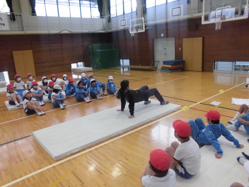 1年生体育科「とびばこ」では、みんなで協力して、マットや跳び箱を準備・後片付けする姿が見られました。跳び箱に慣れるために、飛び上がりおり、飛び越しを行いました。手の付き方、ふみきりの仕方を教わり、馬乗り移動で跳び箱運動をしました。最後には、タイミングよく、跳べるようになる子も数名いました。