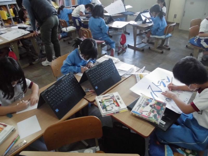 4年生の書写の時間では、「白馬」「はす」の毛筆を行いました。曲がりに気を付けて筆を進めていました。書くスタイルは、子どもたち一人一人様々で、集中して一画ずつ書き進める子や一気に書き上げる子がいました。