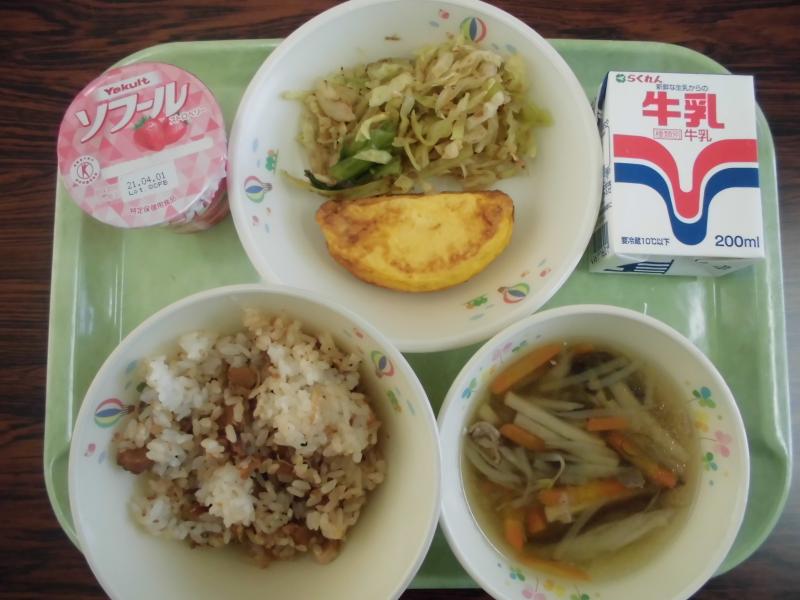 今日の給食メニューは、いりこ菜ご飯、牛乳、かつおのアーモンドからめ、酢の物、若竹汁です。634kcal、タンパク質27.3g、脂質18.0g、塩分2.2gです。献立のねらいは「旬の食材の鰹やたけのこを味わう」です。初夏が旬の鰹やたけのこを献立に取り入れました。味わって食べてください。