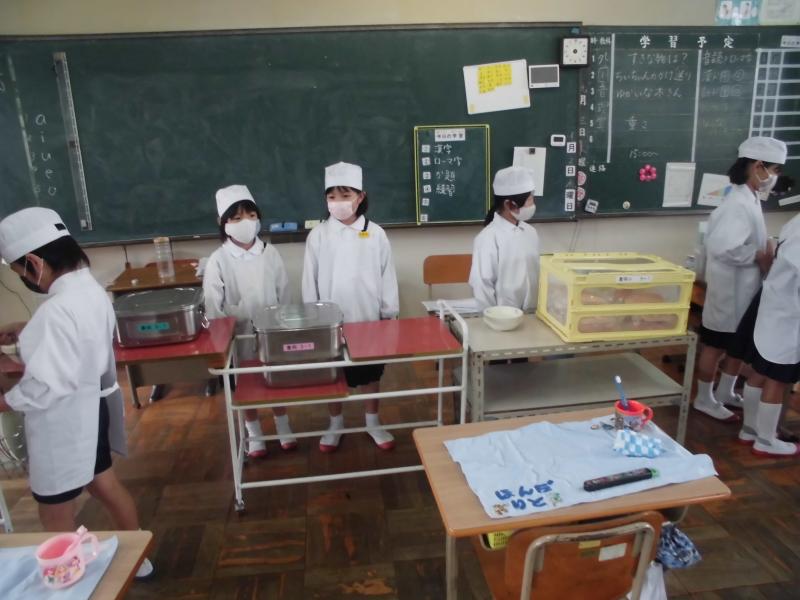 今日の給食メニューは、ご飯、牛乳、鮭のマヨネーズ焼き、カシューナッツ和え、かきたま汁、みかんです。659kcal、タンパク質26.9g、脂質20.8g、塩分1.6gです。献立のねらいは、「箸で骨を取りながら鮭を食べる」です。将来は、箸を上手に使いながら、鮭を食べれるようになればと願っています。第1学年の給食の様子もお知らせします。給食の配膳も手際よくでき、待っている態度もすばらしかったですよ。「いただきます。」と感謝の気持ちを込めて言えているものすばらしいと感じました。