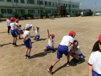 2年生 体育科でボールなげゲーム、てつぼうあそびをしました。(写真は準備体操をしているところです。)