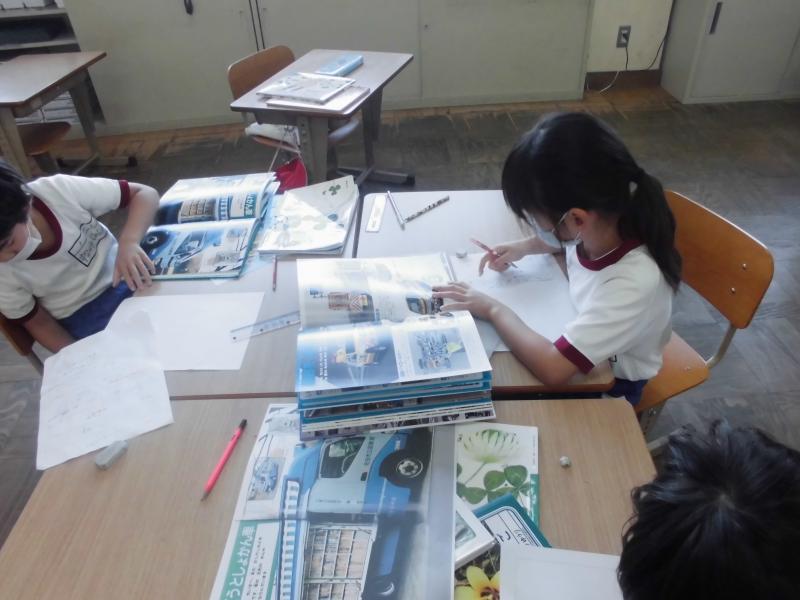 1年生の国語科「自動車ずかんをつくろう」では、絵本やクロームブックを使って自動車ずかんの材料を集めて、文章で表す学習をしていました。文字で相手に伝えることの学習です。図鑑を作成するには、絵の他に説明文が必要なので、みんな一生懸命に文章を考えていました。