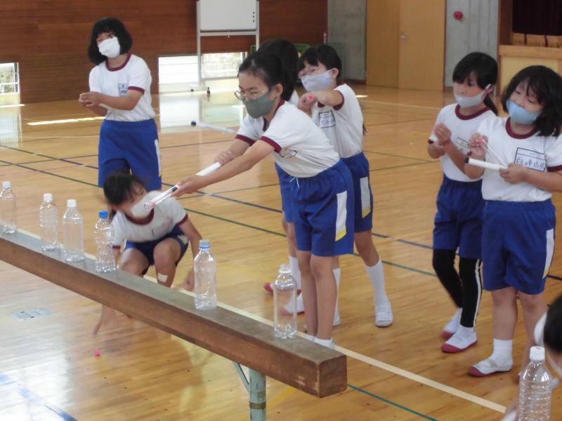 4年生理科「空気と水」では、空気と水を押し縮めるとどうなるのか実験します。今日は、実験セットを使って空気を圧縮する遊びをしました。「空気てっぽう」です。空気が押し縮められ玉が飛び出すことを学びました。ペットボトルを的にして、強く玉を当てるにはどうしたらよいか考えて行動しました。