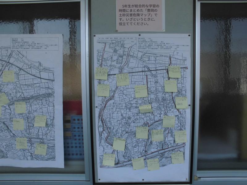 5年生「総合的な学習の時間」で土砂災害危険マップを作成しました。校区内の地図に危険箇所をマークして、何故危険なのか考えた理由も書き入れました。災害が「起こるはずがない」との考えは捨て、「起こってもおかしくない」の意識をもって学習できていました。マップは全校児童が見ることができる児童会室前に掲示してあります。